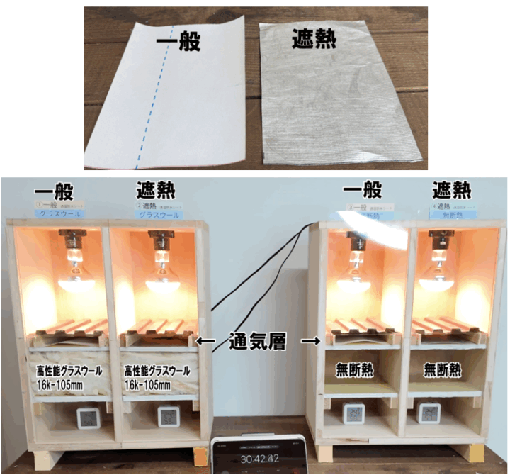 上から、熱源(電球)、外壁(ガルバ)通気層、透湿防水シート(一般・遮熱)、耐震ボード、断熱材(または無断熱)、プラスターボード、室内には温度計を設置しております。