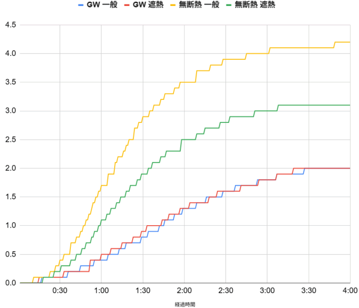 3と4の無断熱では一般シートのほうが温度上昇が大きく、遮熱シートの効果はある状態でした。